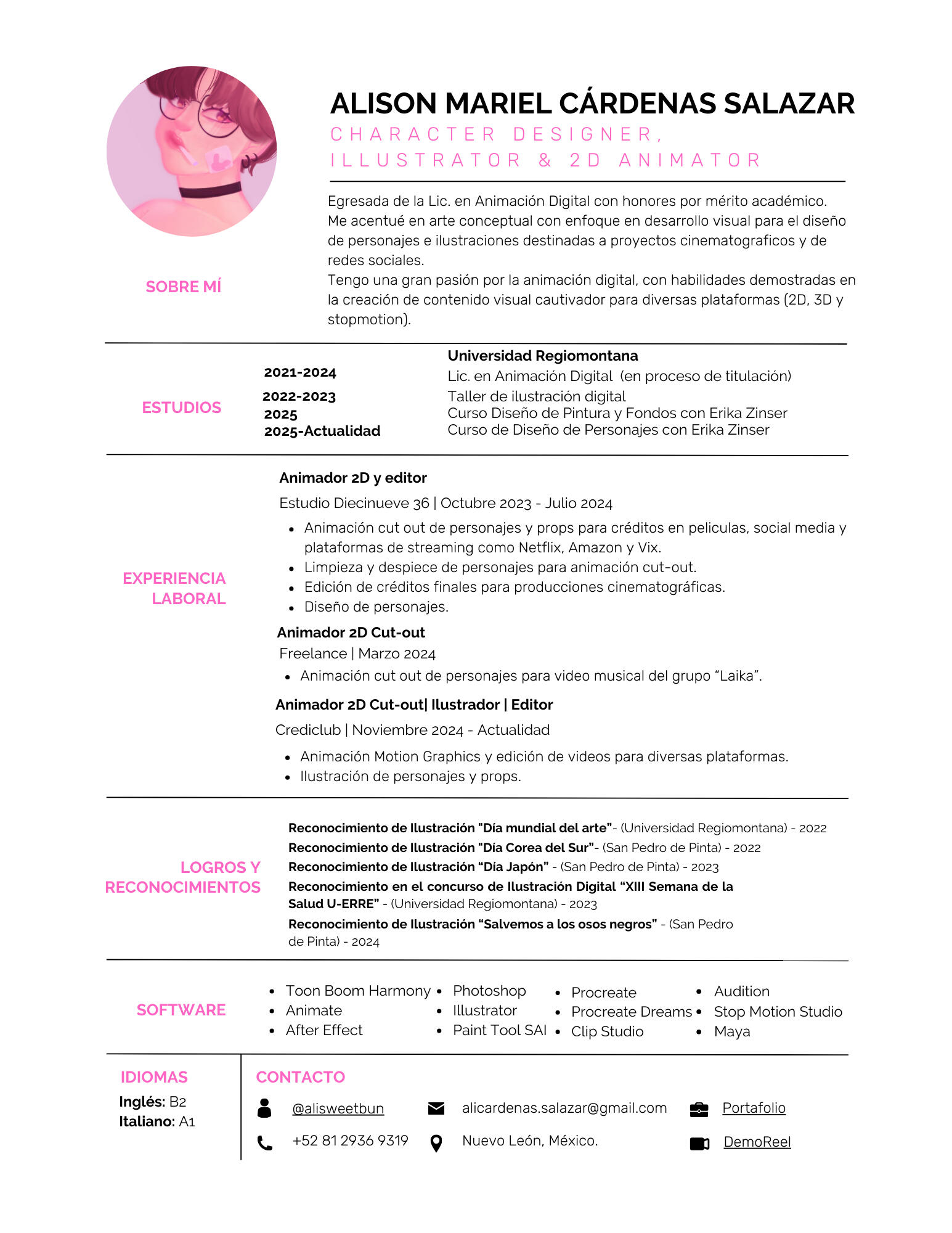 Cuento con 1 año y medio de experiencia en la industria de la animación.